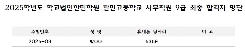 2025Çг⵵ Çб³¹ýÀÎÇѹÎÇпø ÇѹΰíµîÇб³ »ç¹«Á÷¿ø 9±Þ ÃÖÁ¾ ÇÕ°ÝÀÚ °ø°í