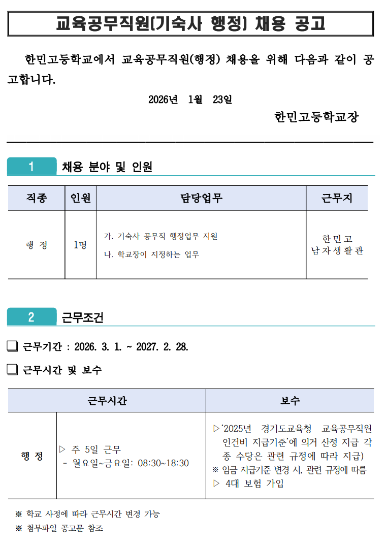 ÇѹΰíµîÇб³ ±³À°°ø¹«Á÷¿ø(±â¼÷»ç ÇàÁ¤) ä¿ë °ø°í