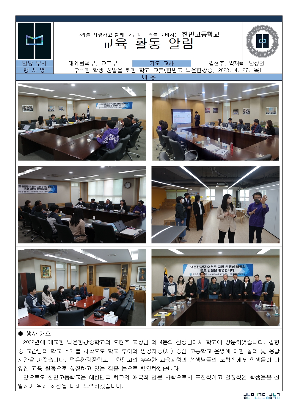 2023-26. ¿ì¼öÇÑ Çлý ¼±¹ßÀ» À§ÇÑ Çб³ ±³·ù(Çѹΰí-´öÀºÇѰ­Áß, 2023. 4. 27. ¸ñ 14½Ã)