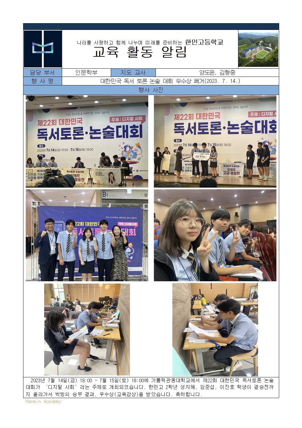 2023-75. ´ëÇѹα¹ µ¶¼­ Åä·Ð ³í¼ú ´ëȸ ¿ì¼ö»ó Äè°Å(2023. 7. 14.)
