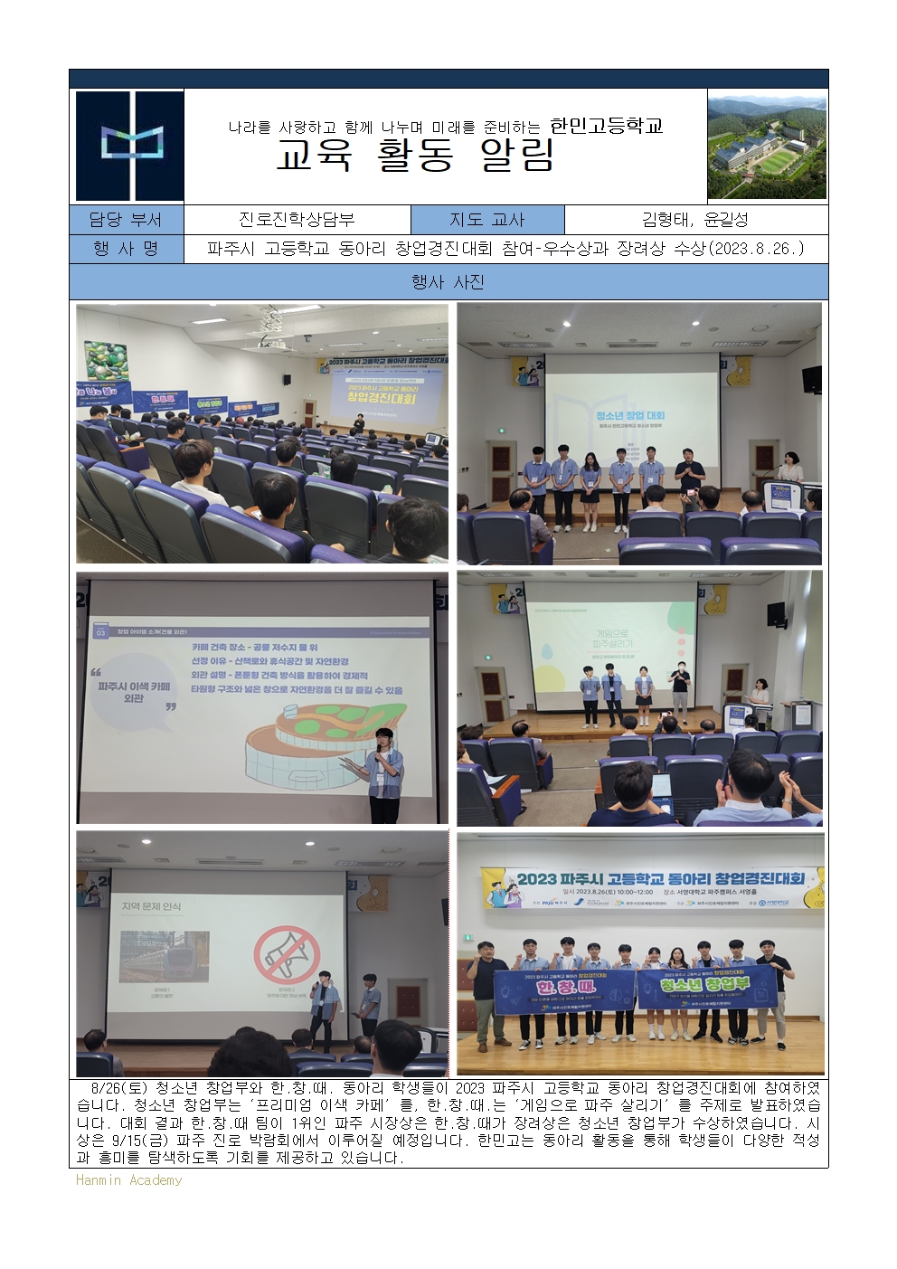2023-76. °íµîÇб³ â¾÷°æÁø´ëȸ ¿ì¼ö»ó, Àå·Á»ó ¼ö»ó(2023. 8.26)