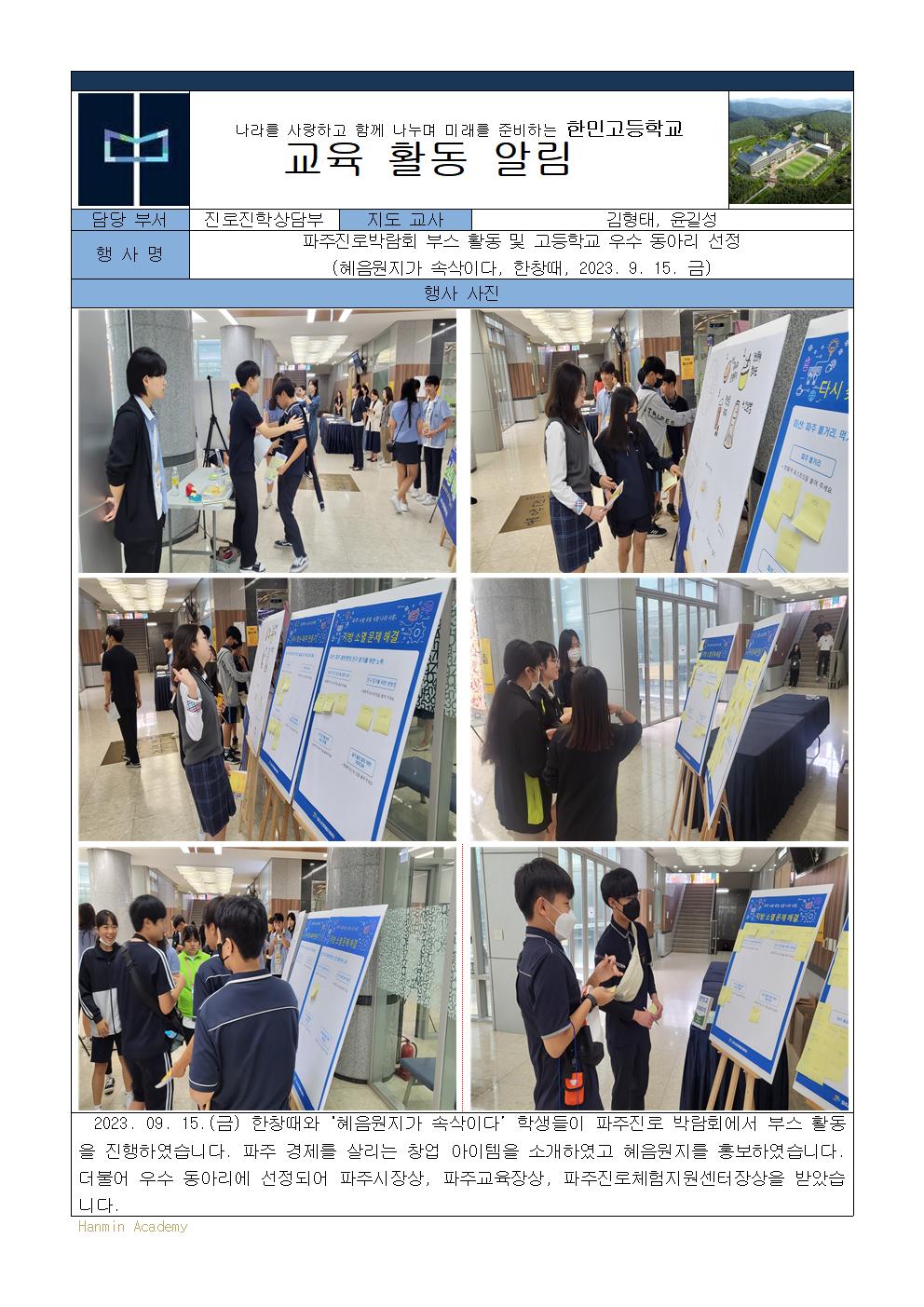 2023-100. ÆÄÁÖÁø·Î¹Ú¶÷ȸ Âü¿© ¹× °íµîÇб³ ¿ì¼ö µ¿¾Æ¸® ¼±Á¤(ÇýÀ½¿øÁö°¡ ¼Ó»èÀÌ´Ù, ÇÑâ¶§, 2023. 9. 15. ±Ý)