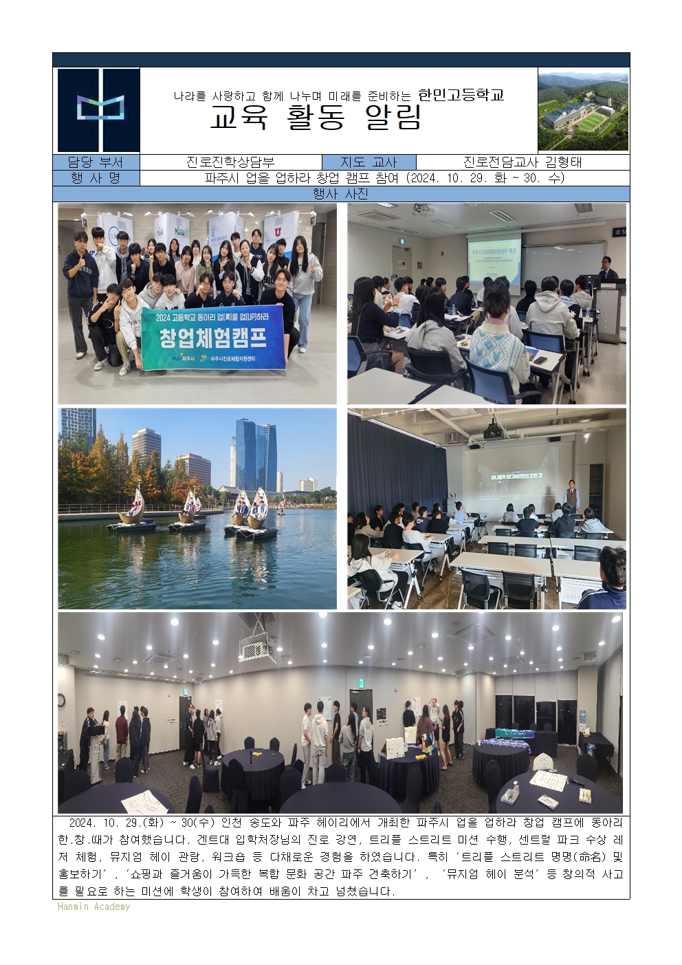 2024-101. ÆÄÁֽà ¾÷À» ¾÷Ç϶ó â¾÷ Ä·ÇÁ Âü¿© (2024. 10. 29. È­ ~ 30. ¼ö)