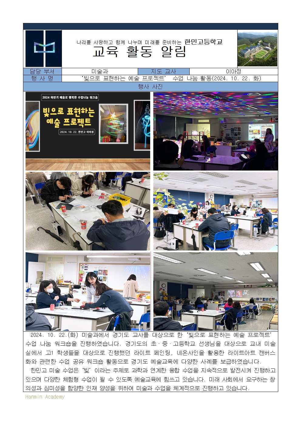 2024-116. ¡®ºûÀ¸·Î Ç¥ÇöÇÏ´Â ¿¹¼ú ÇÁ·ÎÁ§Æ®¡¯ ¼ö¾÷ ³ª´® Ȱµ¿(2024. 10. 22. È­)
