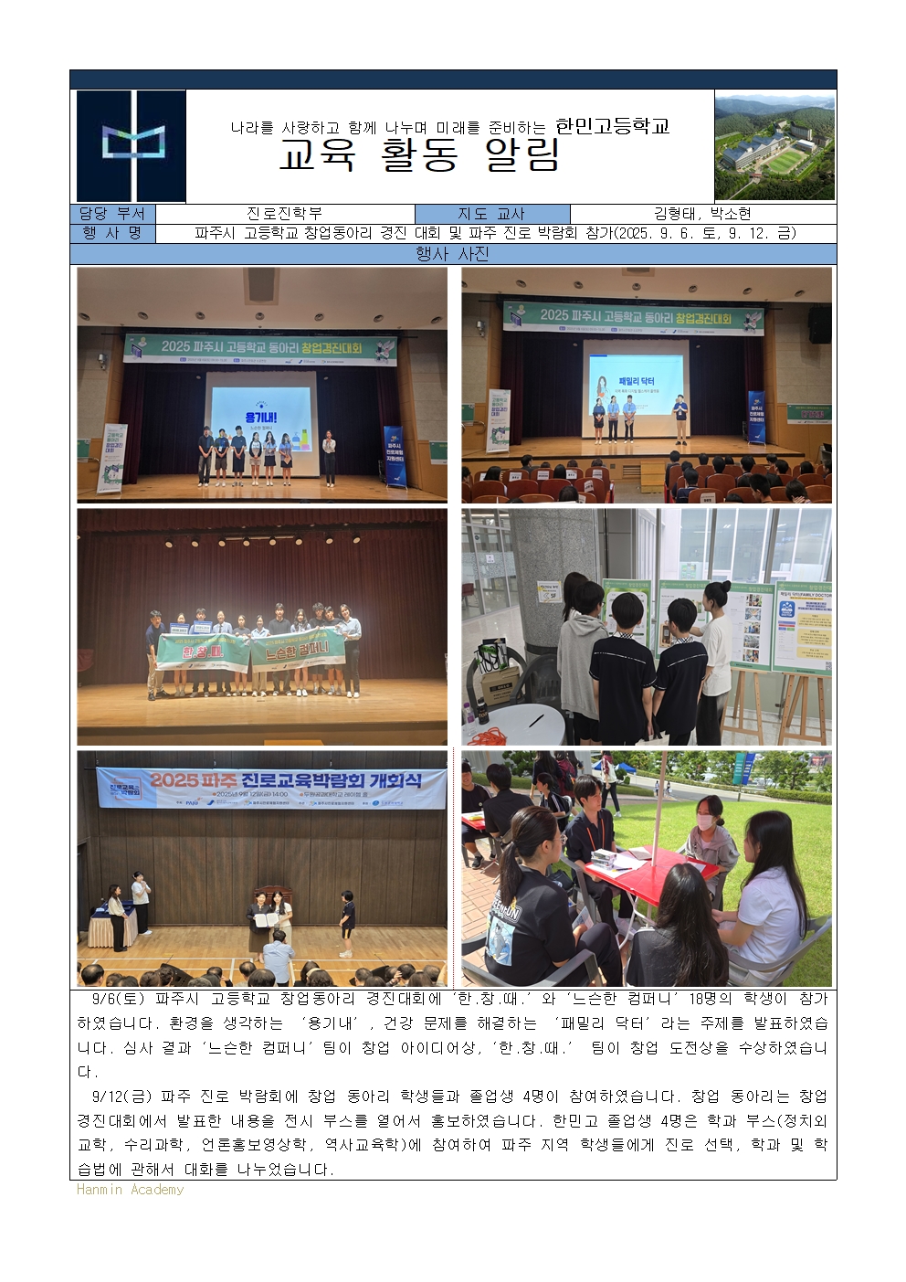 2025-60. ÆÄÁֽà °íµîÇб³ â¾÷µ¿¾Æ¸® °æÁø ´ëȸ ¹× ÆÄÁÖ Áø·Î ¹Ú¶÷ȸ Âü°¡(2025. 9. 6. Åä, 9. 12. ±Ý)
