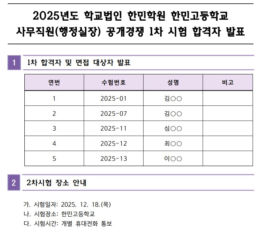 2025³â Çб³¹ýÀÎ ÇѹÎÇпø ÇѹΰíµîÇб³ 5±Þ »ç¹«Á÷¿ø(ÇàÁ¤½ÇÀå) °ø°³°æÀï ä¿ë 1Â÷ ÇÕ°ÝÀÚ ¹ßÇ¥