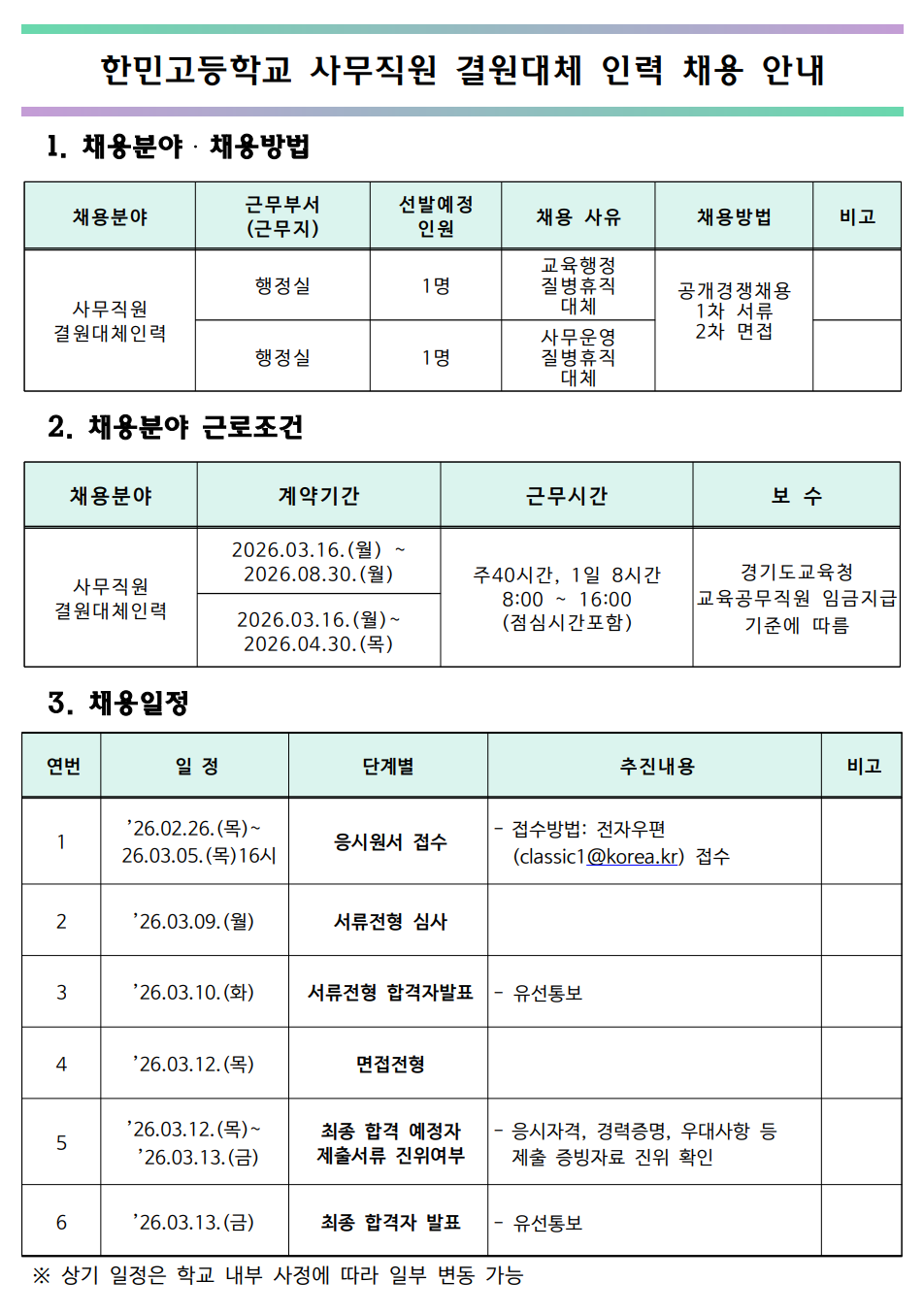 ÇѹΰíµîÇб³ »ç¹«Á÷¿ø °á¿ø´ëü Àη ä¿ë °ø°í