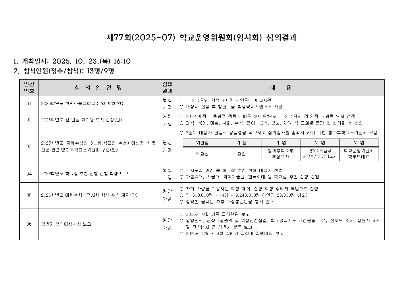 Á¦77ȸ(2025-07) Çб³¿î¿µÀ§¿øÈ¸(ÀÓ½Ãȸ) ½ÉÀǰá°ú