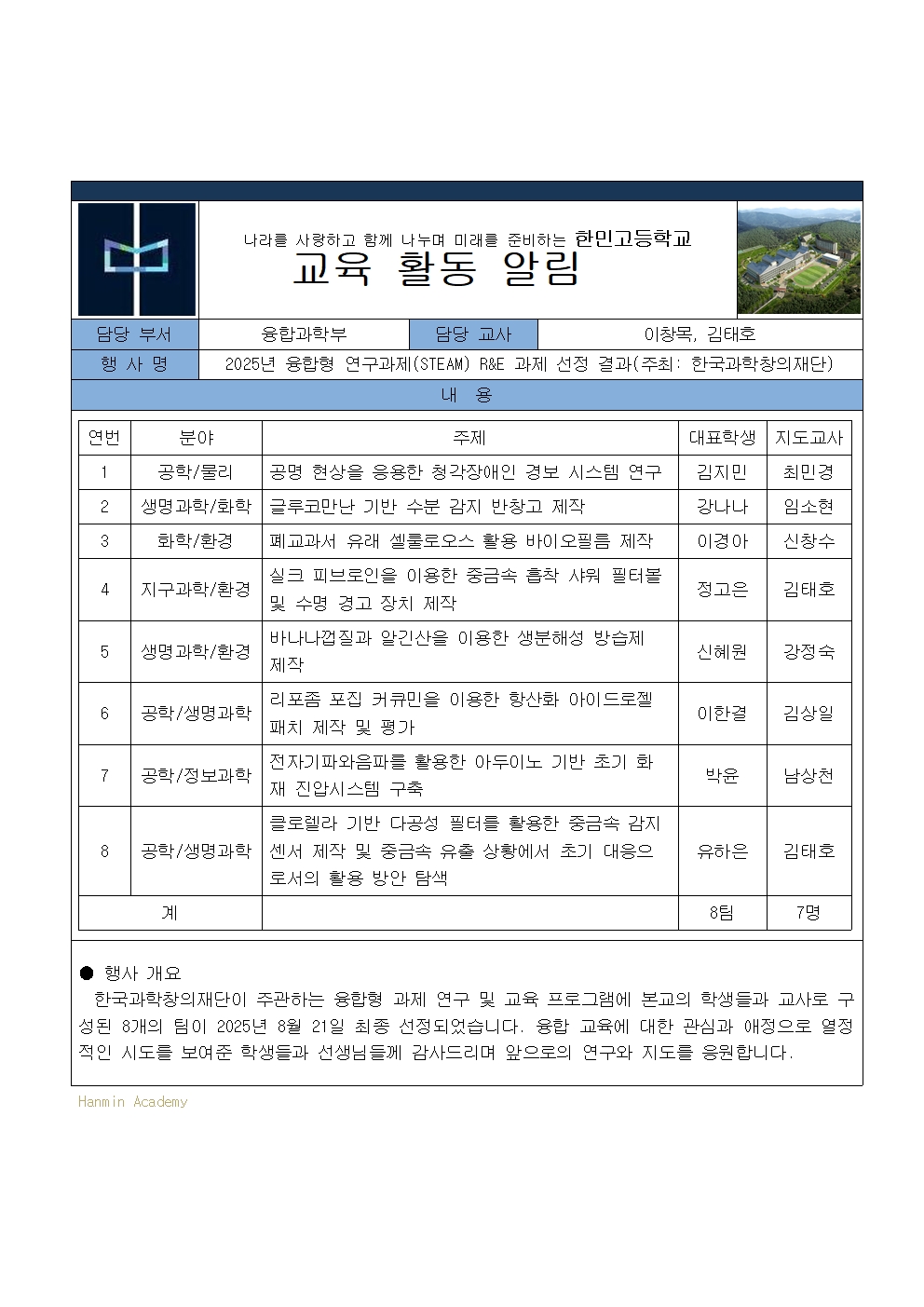 2025-100. 2025³â À¶ÇÕÇü ¿¬±¸°úÁ¦(STEAM) R&E °úÁ¦ ¼±Á¤ °á°ú